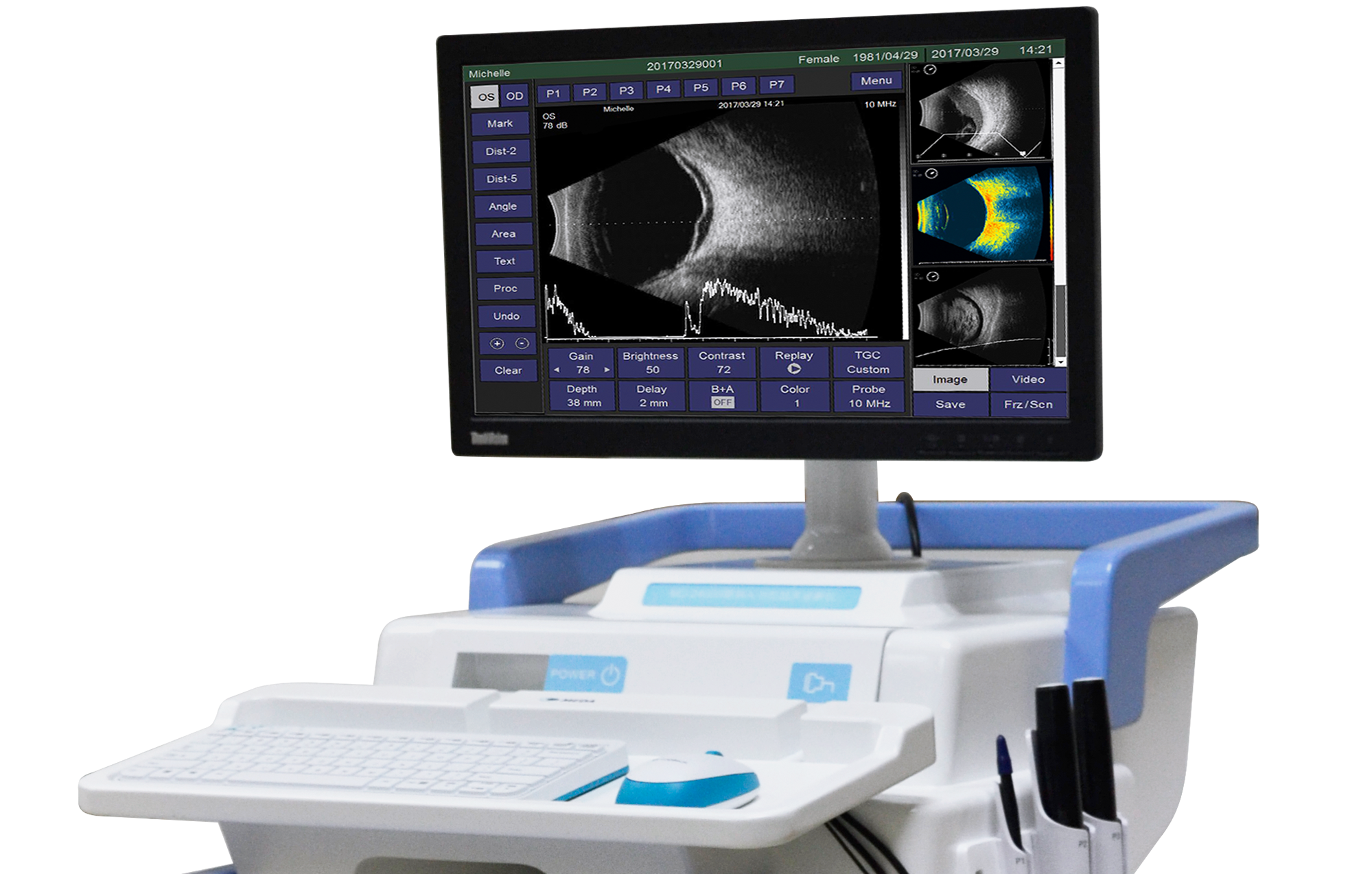 MD-2400S眼科A/B型超声诊断仪是一种眼科专用超声影像设备,由主机、显示器、10MHz的A超探头、10MHz、20MHz的B超探头、隔离电源、台车、脚踏开关、鼠标和键盘组成。