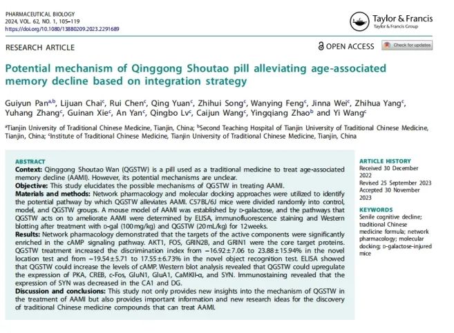 Potential mechanism of Qinggong Shoutao pill alleviating age-associated memory decline based on integration strategy.[J] .Pharm Biol, 2024, 62: 105-119.